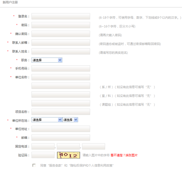2.進(jìn)入注冊(cè)頁(yè)面,根據(jù)要求認(rèn)真填寫(xiě)注冊(cè)信息,帶紅色標(biāo)記的為必填項(xiàng),并同意注冊(cè)條款,就可生成新用戶。