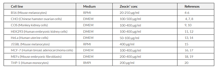 Zeocin?通常以100 μg/ml的濃度使用,即將原液(100 mg/ml in HEPES buffer)稀釋1000倍使用。但也需要根據(jù)您的具體細(xì)胞來確定最佳濃度。下表列出了在一些哺乳動物細(xì)胞篩選實例中的Zeocin?建議濃度。